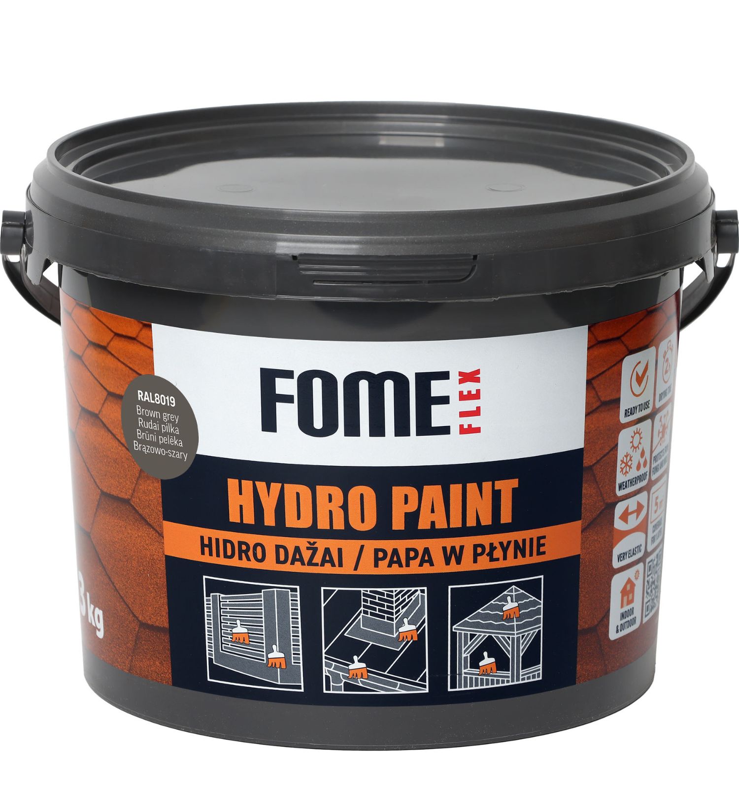 FOME FLEX HYDRO PAINT – fast drying, one-component, multi-purpose acrylic liquid paint and sealant, brown grey RAL8019, 3 kg. It is ready-to-use and highly flexible coating used to protect, seal and decorate surfaces such as concrete, trapezoidal and galvanized sheet metal, bitumen shingles, roofing felt, metal, ceramic and cement roof tiles, plaster, and wood.