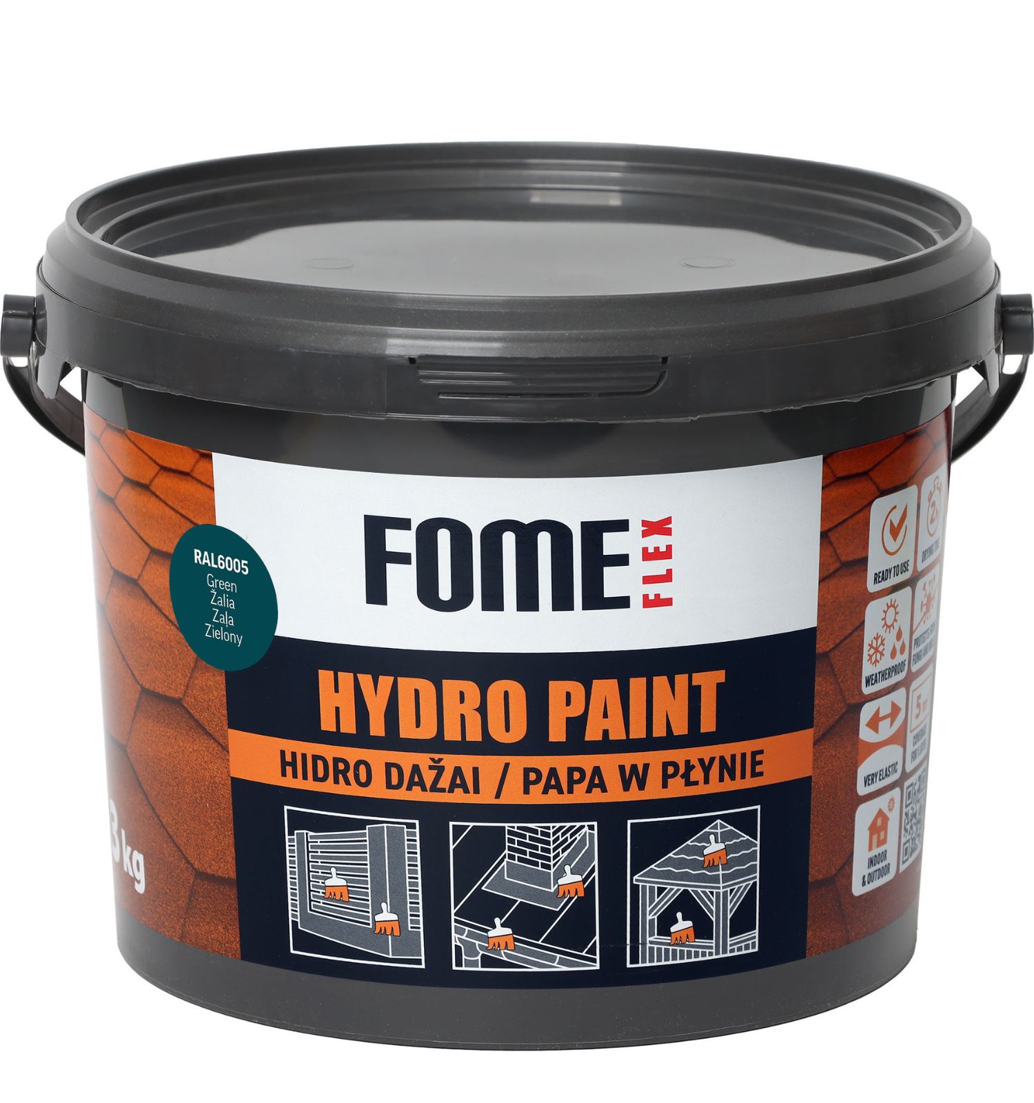 FOME FLEX HYDRO PAINT – fast drying, one-component, multi-purpose acrylic liquid paint and sealant, green RAL6005, 3 kg. It is ready-to-use and highly flexible coating used to protect, seal and decorate surfaces such as concrete, trapezoidal and galvanized sheet metal, bitumen shingles, roofing felt, metal, ceramic and cement roof tiles, plaster, and wood.