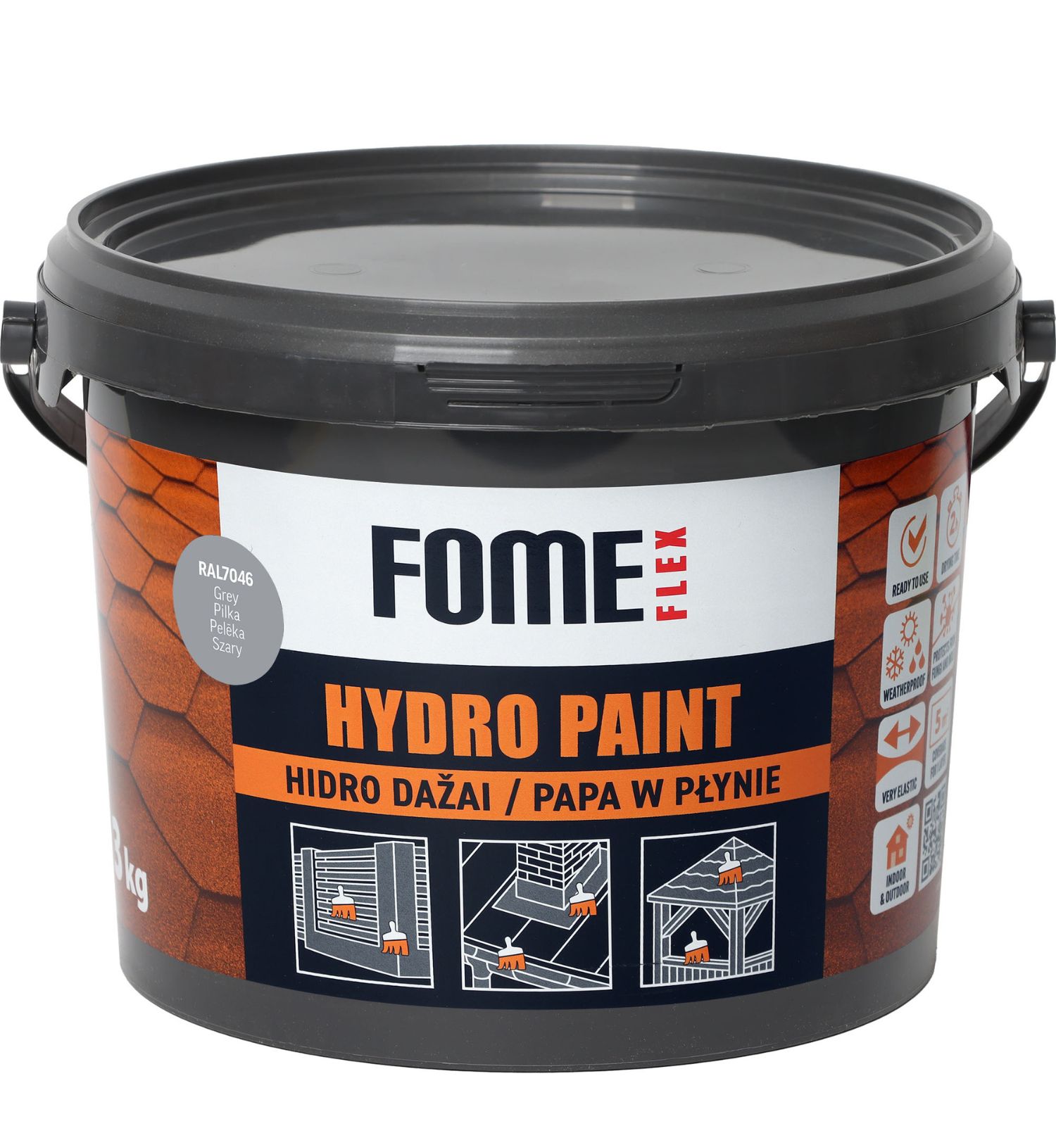 FOME FLEX HYDRO PAINT – fast drying, one-component, multi-purpose acrylic liquid paint and sealant, grey RAL7046, 3 kg. It is ready-to-use and highly flexible coating used to protect, seal and decorate surfaces such as concrete, trapezoidal and galvanized sheet metal, bitumen shingles, roofing felt, metal, ceramic and cement roof tiles, plaster, and wood.